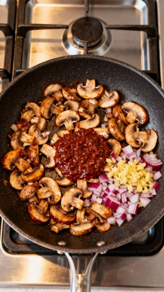 Add chopped mushrooms and 1 tbsp doubanjiang. Stir and cook for 5–6 minutes, until mushrooms are browned and coated in the red paste.