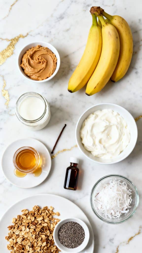 - Toppings: sliced banana, granola, peanut butter drizzle, chia seeds, coconut flakes