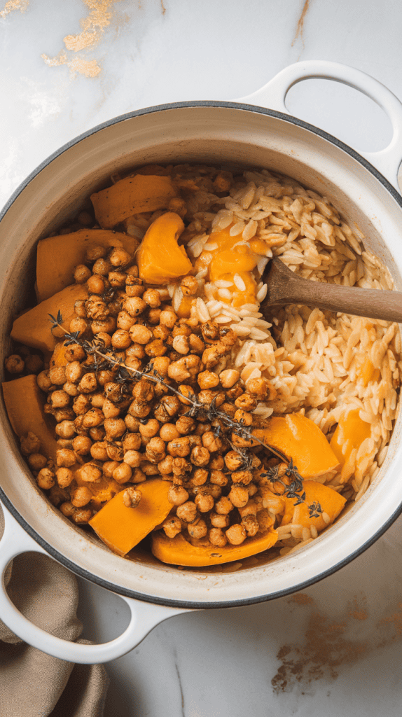 I made this for dinner on a chilly fall night and immediately added it to my regular rotation. The way the squash melts slightly into the orzo makes every bite creamy without needing dairy, and those crispy chickpeas? Game changer. This dish is satisfying and flavorful all on its own.