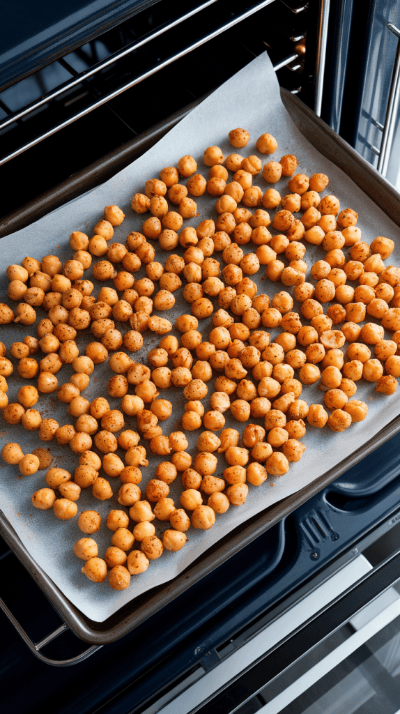 Pat 1 can (15 oz) of chickpeas dry with a clean towel. Toss with 1 tbsp olive oil, ½ tsp smoked paprika, ½ tsp garlic powder, ½ tsp salt, and ¼ tsp black pepper. Spread onto another parchment-lined baking sheet and roast at 425°F for 25–30 minutes, shaking halfway.