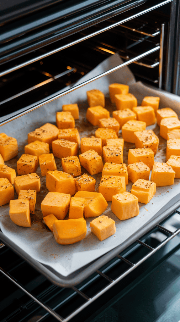 Toss 1½ cups peeled and cubed butternut squash with 1 tbsp olive oil, ½ tsp salt, and ¼ tsp black pepper. Spread onto a parchment-lined baking sheet and roast at 425°F for 25 minutes, flipping halfway.