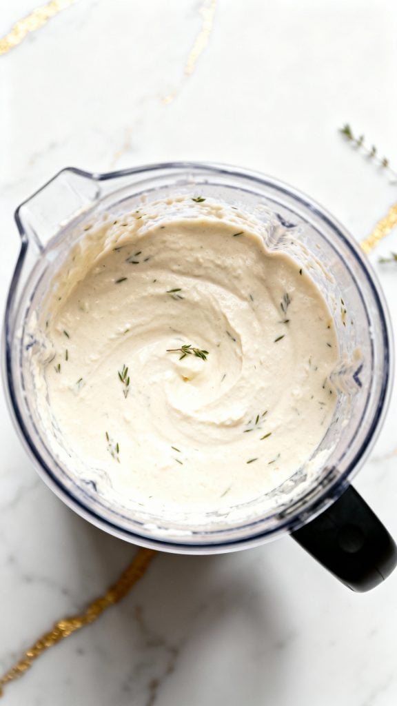 In a blender or food processor, add 1 block (14 oz) silken tofu, 1/2 teaspoon dried thyme, 2 garlic cloves (minced), 1 tablespoon cornstarch, and 1 tablespoon nutritional yeast (if using). Blend until smooth.