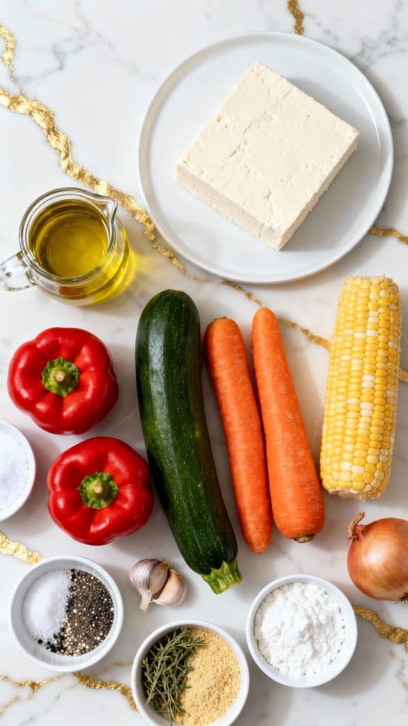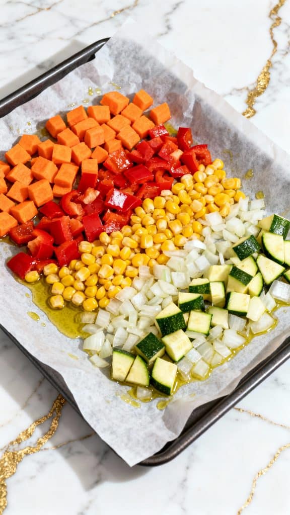 Toss 1/2 red bell pepper (diced), 1/2 zucchini (diced), 1/2 carrot (diced), 1/4 cup corn, and 1 small diced onion with 1 tablespoon olive oil, 1/4 teaspoon salt, and 1/4 teaspoon ground black pepper. Spread on a baking sheet and roast at 400°F for 20–25 minutes until soft and slightly caramelized.