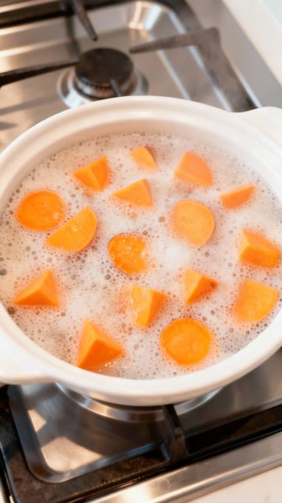 Add 2 peeled and chopped sweet potatoes to a pot of salted water. Bring to a boil, then simmer for 15–20 minutes until fork-tender.