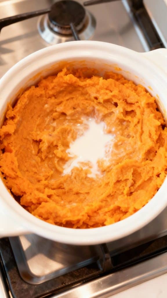 Drain the cooked sweet potatoes and return them to the pot. Add 2 tablespoons plant-based milk, salt, and pepper to taste. Mash until smooth and creamy.