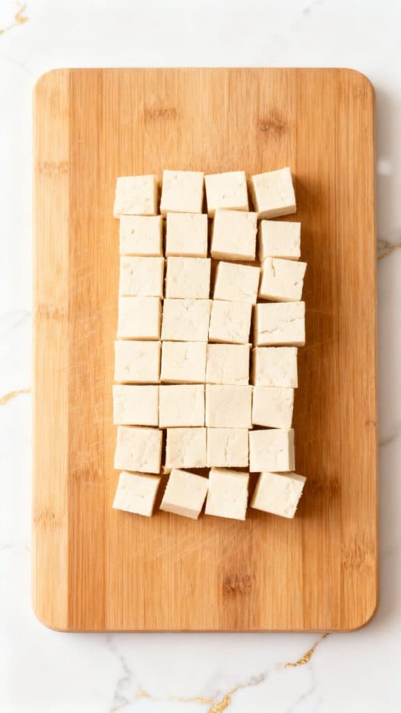 While the potatoes cook, press the tofu for 10 minutes to remove water, then cut into even cubes.