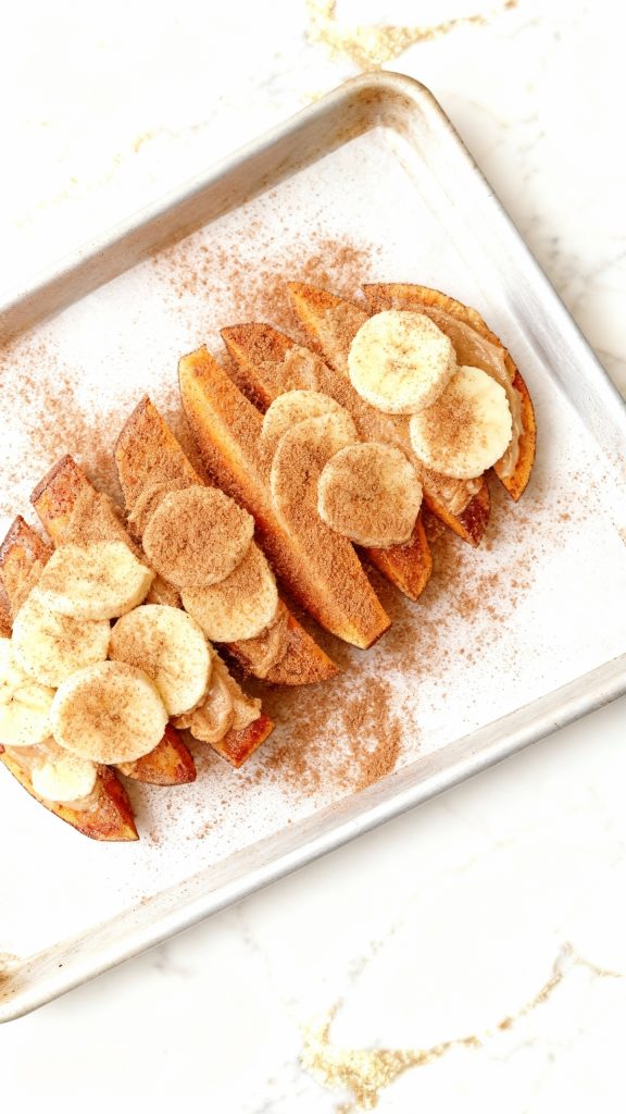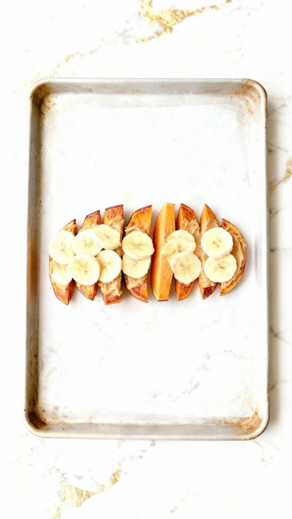 Top each almond-buttered sweet potato slice with banana rounds, laying them in a neat row or slightly overlapping.