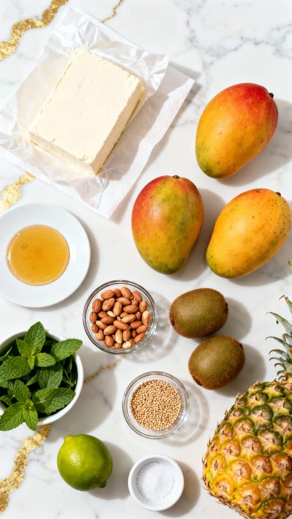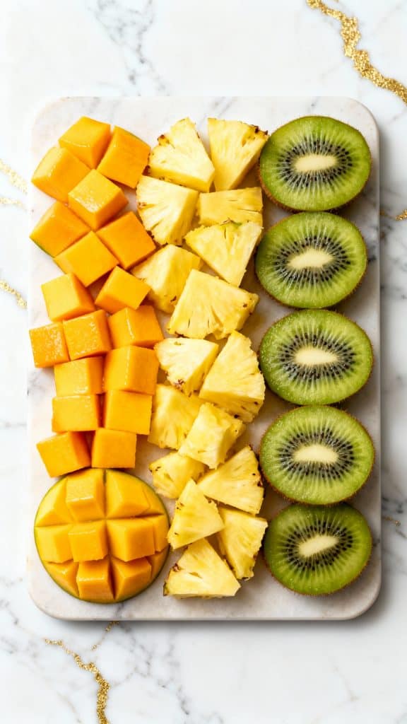Dice 1 ripe mango, chop 1/2 cup of fresh pineapple into bite-sized chunks, and slice 2 peeled kiwis into rounds.