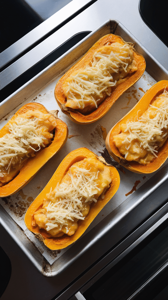 Spoon the filling back into the squash shells evenly. Top with a little extra cheddar or parmesan if desired. Place back on the baking sheet and bake at 375°F for 15–20 minutes until heated through and lightly golden on top.