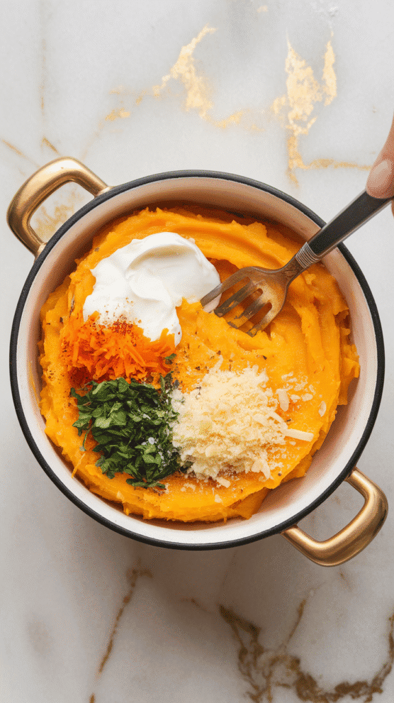 To the bowl of squash, add 2 tbsp unsalted butter, ¼ cup sour cream, ½ cup shredded sharp cheddar cheese, ¼ cup grated parmesan, 1 minced garlic clove, 1 tbsp chopped parsley, and a pinch of red pepper flakes (optional). Mash with a fork until mostly smooth with some texture.