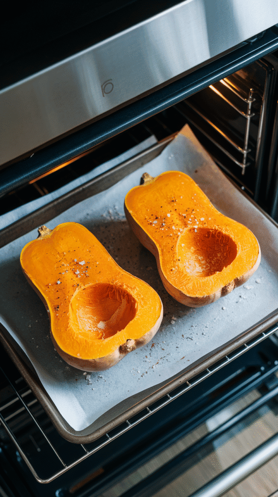Preheat oven to 400°F. Cut 1 medium butternut squash in half lengthwise and scoop out the seeds. Brush the cut sides with 1 tbsp olive oil and sprinkle with ½ tsp salt and ¼ tsp black pepper. Place cut side down on a parchment-lined baking sheet. Bake for 45–50 minutes, until the flesh is tender.