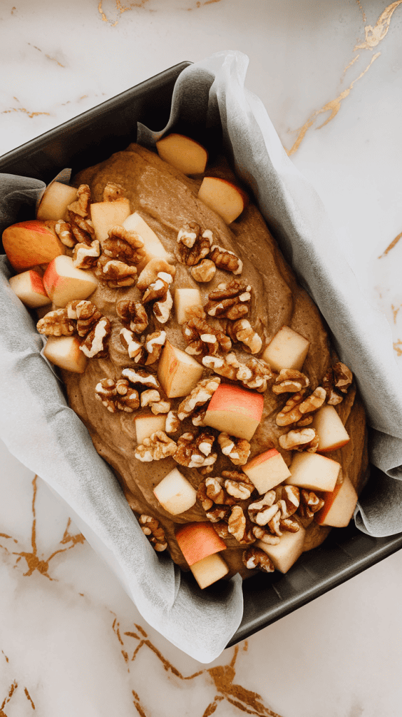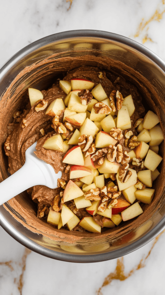 Gently fold in 1 ½ cups peeled, diced apples and optional ¼ cup chopped walnuts using a spatula until evenly mixed.