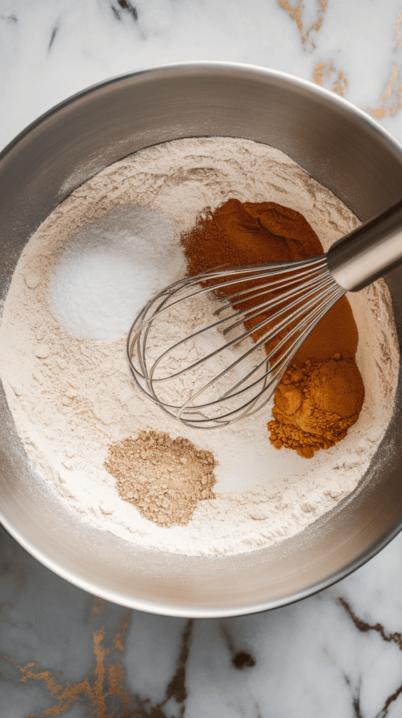 In a large bowl, whisk together 1 ½ cups all-purpose flour, 1 tsp baking soda, ½ tsp salt, 1 tsp ground cinnamon, and ¼ tsp ground nutmeg.