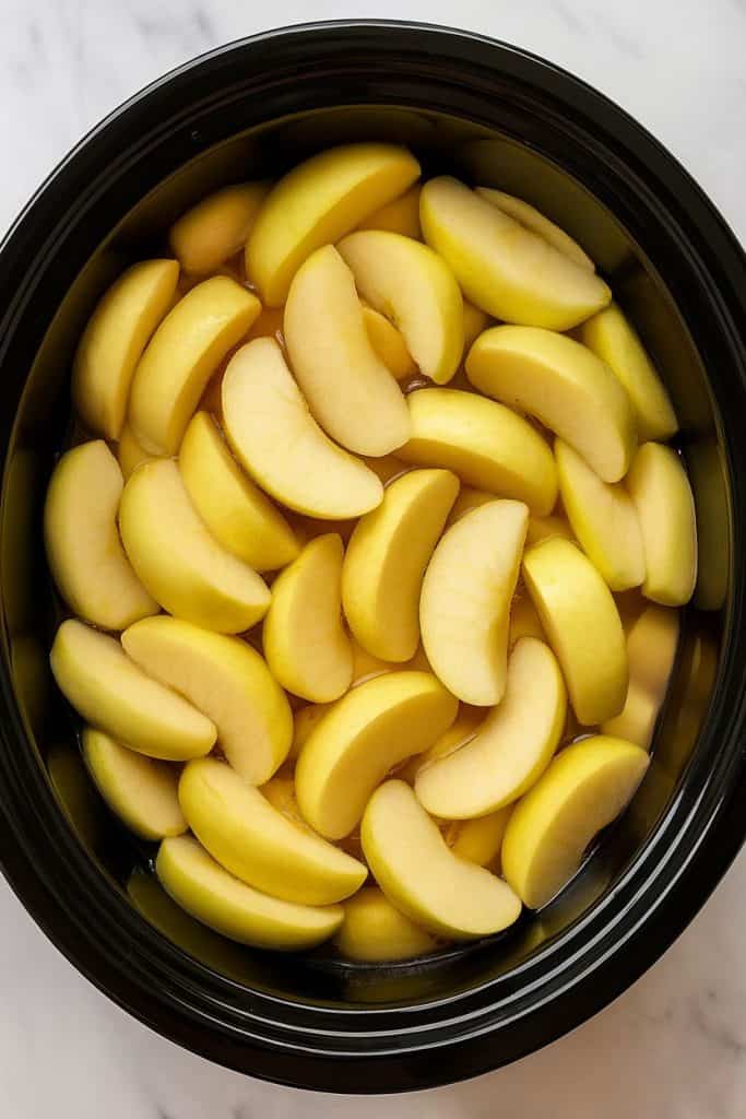 Place 5 lbs of peeled, cored, and sliced apples into the slow cooker with 3/4 cup of unsweetened apple juice.