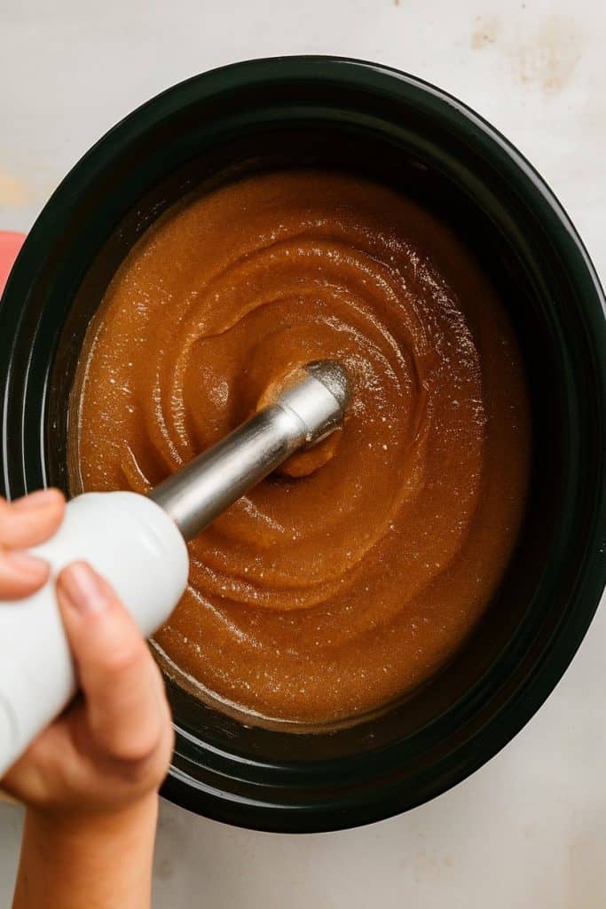 After 10 hours, use an immersion blender to puree the mixture until completely smooth.