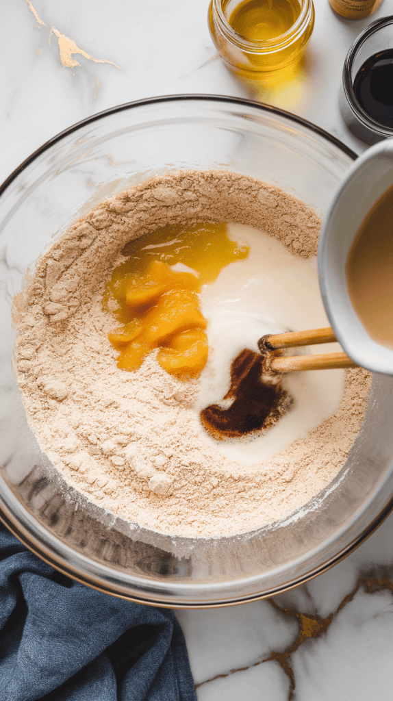 Pour in 1 cup unsweetened applesauce, ½ cup neutral oil, ¼ cup plant-based milk, and 2 teaspoons vanilla extract to the dry mixture. Stir until just combined.