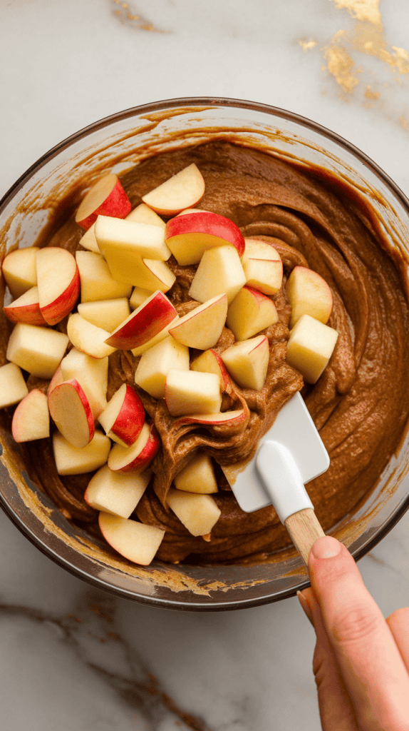 Add 1½ cups diced apples to the batter and gently fold until evenly distributed.