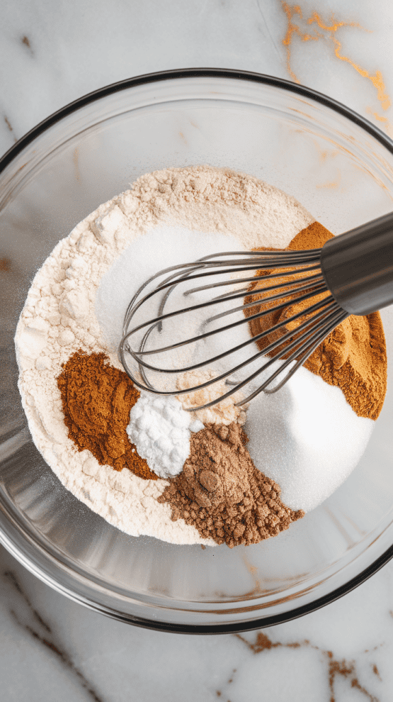 In a large bowl, whisk together 2 cups all-purpose flour, ¾ cup cane sugar, 2 teaspoons baking powder, ½ teaspoon baking soda, ½ teaspoon salt, 1 teaspoon cinnamon, and ½ teaspoon nutmeg until evenly combined.