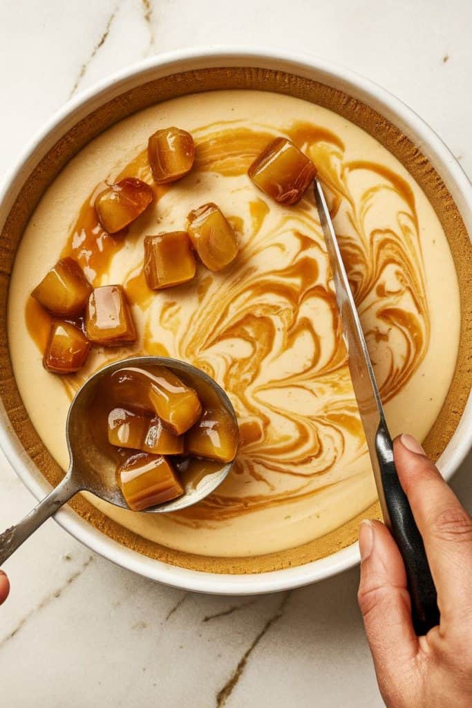 Pour the cheesecake filling into the crust. Spoon the apple mixture over the top in small spoonfuls. Use a knife or toothpick to gently swirl the apples into the filling.