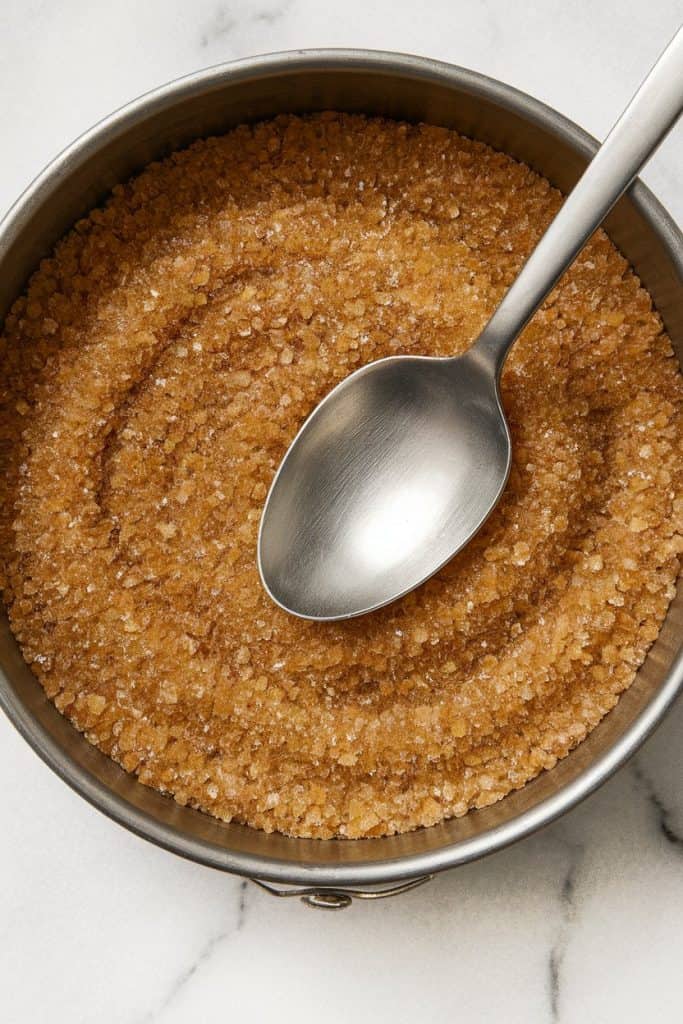 In a mixing bowl, combine 1 ½ cups vegan graham cracker crumbs, ¼ cup melted vegan butter, and 1 tbsp maple syrup. Stir until it looks like wet sand. Press the crust into the bottom of an 8-inch springform pan and slightly up the sides.