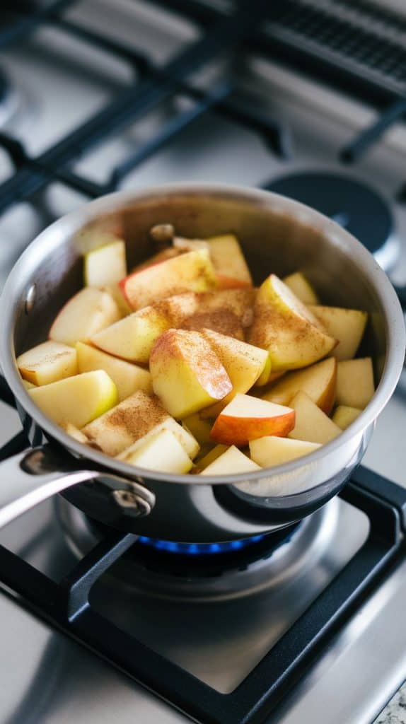 In a small saucepan over medium heat, cook 1 peeled and diced apple with 1 tbsp coconut oil, 2 tbsp maple syrup, 1 tsp cinnamon, and a pinch of nutmeg. Stir until apples are soft and sticky, about 5–7 minutes. Let cool slightly.
