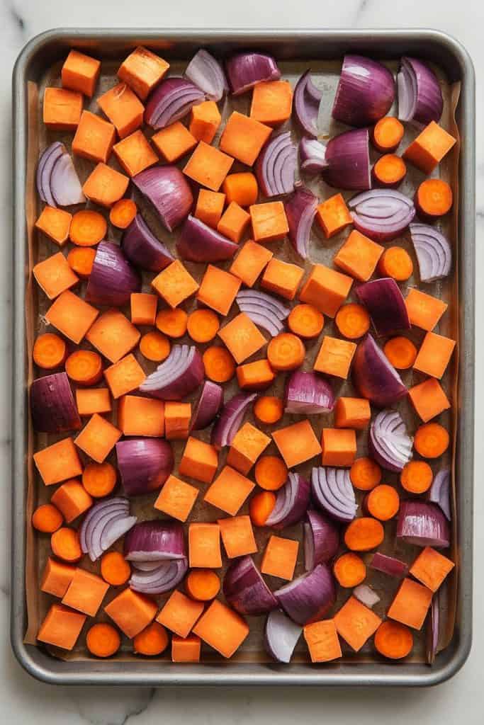 Toss 2 cups chopped sweet potatoes, 1 cup chopped carrots, and 1 chopped red onion with 1 tablespoon olive oil, 1/2 teaspoon salt, and 1/4 teaspoon black pepper. Spread onto a parchment-lined baking sheet and roast at 425°F (220°C) for 25–30 minutes, flipping halfway.