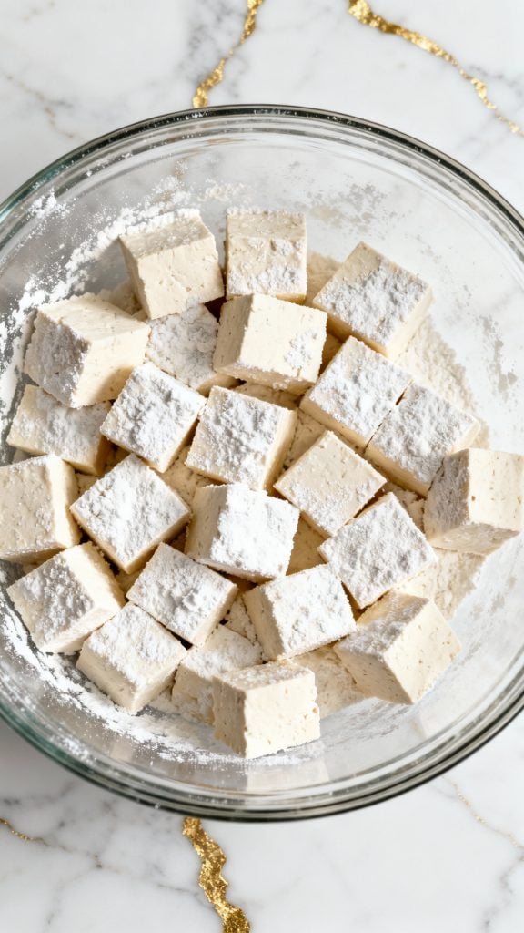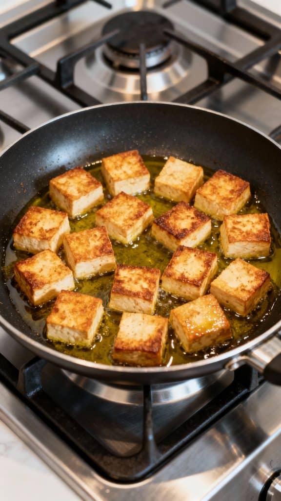 Heat 1 tablespoon olive oil in a skillet over medium heat. Add coated tofu and cook for 3–4 minutes per side, until golden and crispy on all sides. Set aside.
