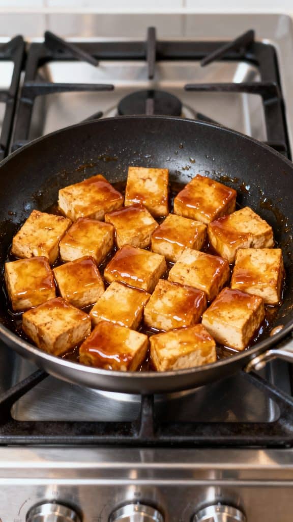 Add the seared tofu to the glaze and toss to coat evenly. Cook for 1–2 more minutes until the tofu is sticky and caramelized.