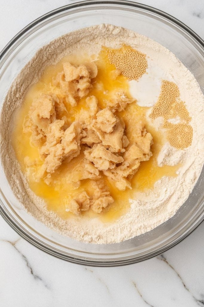 In a large bowl, whisk together 3 ½ cups all-purpose flour, ¼ cup granulated sugar, 1 packet (2 ¼ tsp) instant yeast, and ½ tsp salt. Add 1 cup warm almond milk, ¼ cup melted vegan butter, and 2 tsp vanilla. Stir to form a soft dough.