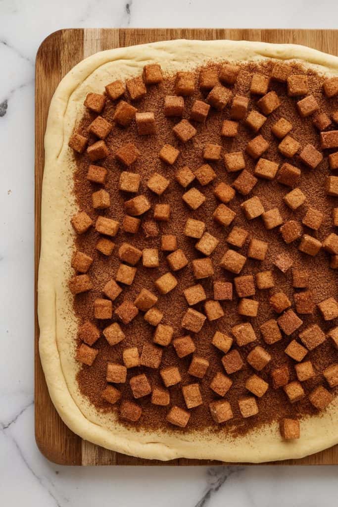 Roll out the dough into a 12×16 inch rectangle. Spread 2 tbsp softened vegan butter evenly over the dough. Then spread the apple-cinnamon filling on top.