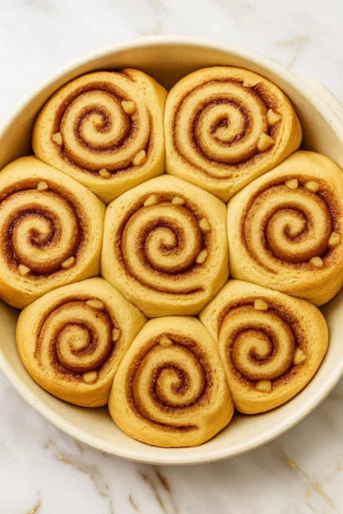 - After cutting the rolls, place them in the baking dish, cover tightly, and refrigerate overnight. Let them come to room temp and rise for 30–45 mins before baking.