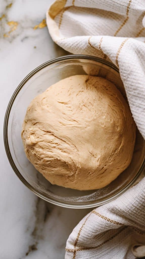 Ultra close-up of smooth kneaded dough resting in a lightly greased bowl, covered with a clean kitchen towel, dough has a soft and pillowy texture, on a white marble counter with hints of gold, taken with an iPhone 15 Pro, top-down shot used by recipe bloggers.