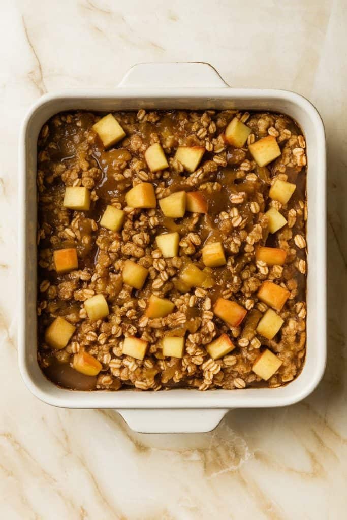 Pour the oatmeal mixture into a greased 8×8 inch baking dish and smooth out the top.