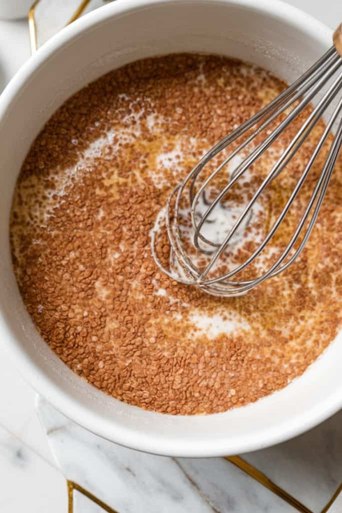 In a large mixing bowl, whisk together 2 tablespoons ground flaxseed and 1 ½ cups unsweetened almond milk. Let it sit for 5 minutes to thicken.