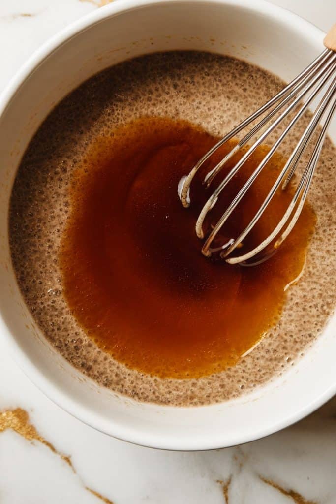 Add 3 tablespoons maple syrup, 1 teaspoon vanilla extract, and 2 tablespoons melted coconut oil to the flax mixture. Whisk until combined.