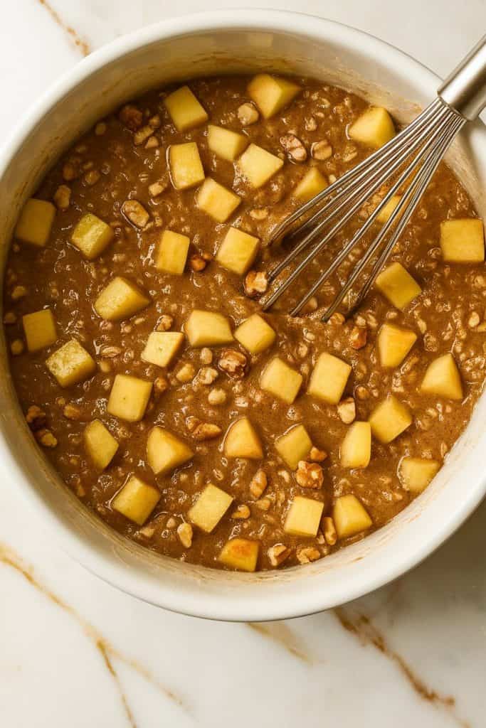 Gently fold in 2 peeled and diced apples and ¼ cup chopped walnuts (optional). Make sure everything is evenly spread.
