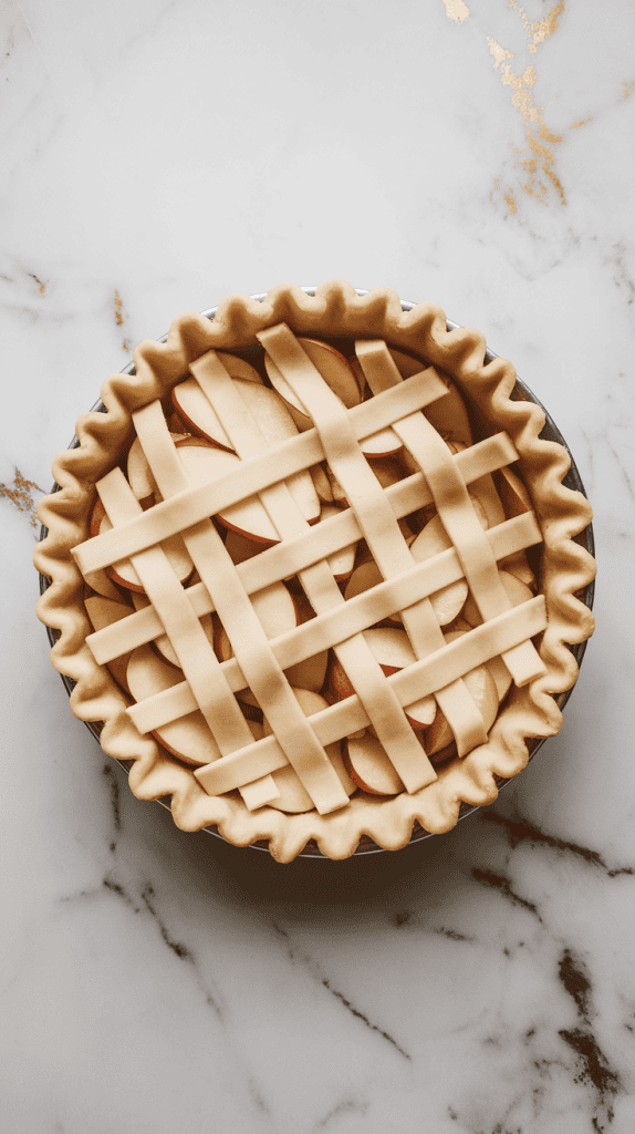 Pour the apple filling into the pie shell. Mound it slightly in the center. Dot with a few small cubes of vegan butter (optional). Add the top crust — either a full cover with slits or a lattice — and crimp the edges to seal.