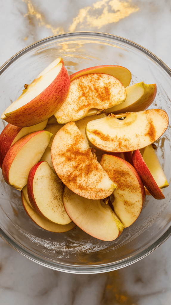 In a large bowl, combine 6–7 peeled and thinly sliced apples, ¾ cup brown sugar, 2 tbsp flour, 1 tbsp lemon juice, 1 tsp cinnamon, ¼ tsp nutmeg, ¼ tsp allspice, and 1 tsp vanilla. Toss until apples are evenly coated.