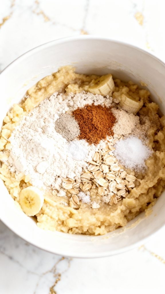Add 1 cup all-purpose flour, 1 ½ cups rolled oats, 1 tsp baking soda, ½ tsp baking powder, ½ tsp cinnamon, and ¼ tsp salt to the bowl. Gently mix until just combined—don’t overmix.