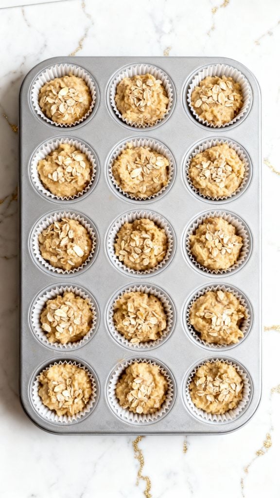 Spoon the batter into a lined muffin tin, filling each cup about ¾ full. Optionally, sprinkle extra oats on top for texture.