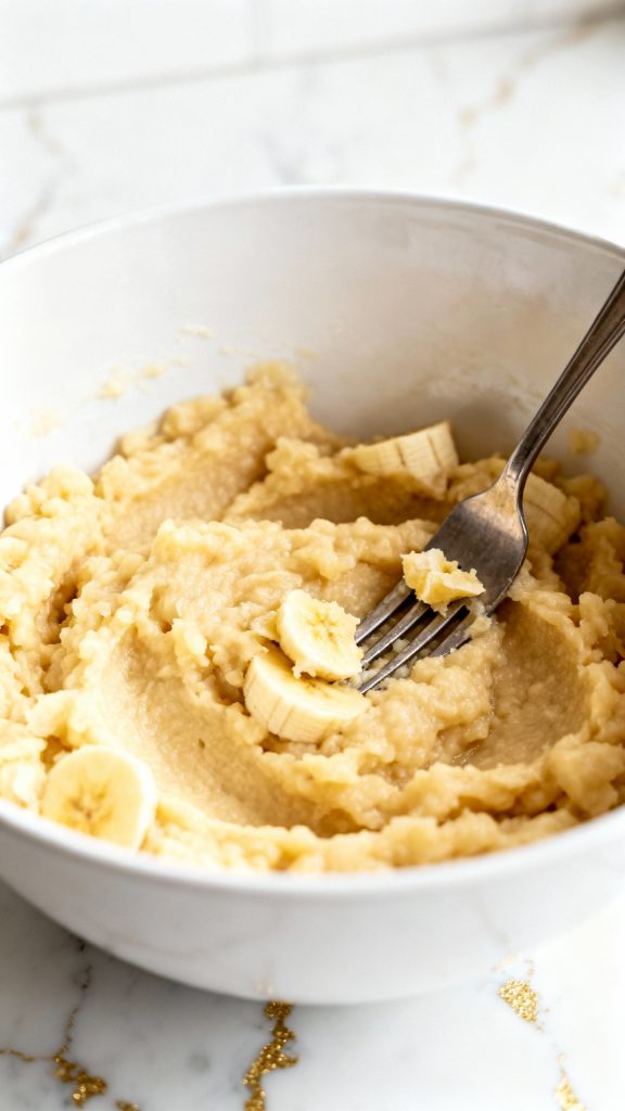 Add 3 ripe bananas to a large mixing bowl and mash with a fork until smooth and slightly chunky.