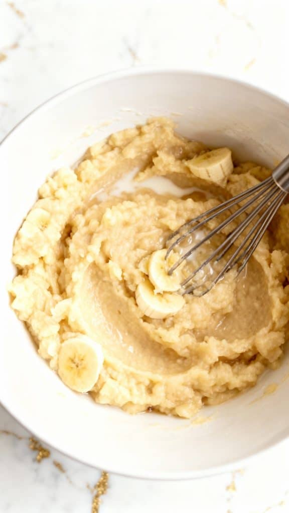 To the mashed bananas, add ½ cup brown sugar, ½ cup non-dairy milk, ¼ cup melted coconut oil, and 1 tsp vanilla extract. Whisk until everything is well combined.