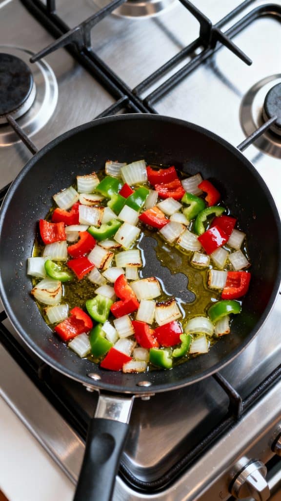 Heat 1 tbsp olive oil in a skillet over medium heat. Add 1/2 diced onion, 1/2 diced red bell pepper, and 1/2 diced green bell pepper. Sauté for 5–6 minutes, until soft and slightly browned.