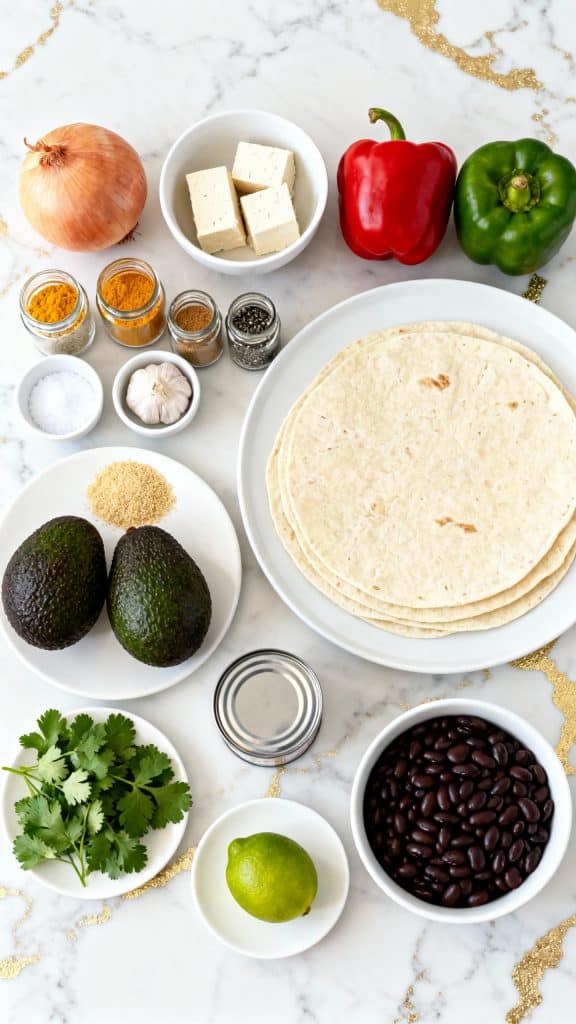 Lay the warm tortilla on the counter. Add a scoop of tofu scramble with beans, a few avocado slices, and sprinkle fresh cilantro. Squeeze a little lime juice if using. Fold and roll tightly into a burrito.