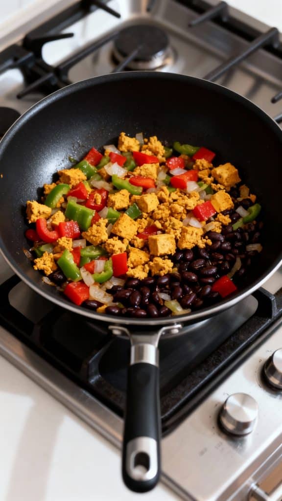 Sprinkle in 1/4 cup nutritional yeast and add 1/2 cup drained black beans. Stir to combine and cook for 2–3 more minutes until heated through.