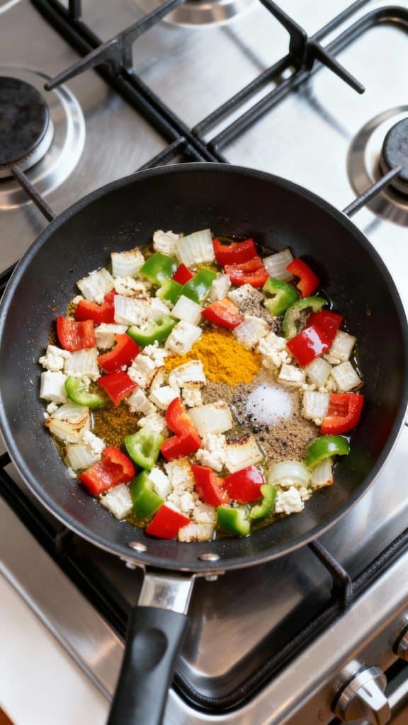 Add the crumbled tofu to the pan. Sprinkle in 1/2 tsp turmeric, 1/2 tsp garlic powder, 1/2 tsp cumin, salt, and black pepper. Stir well and cook for 5–7 minutes, letting the tofu absorb all the spices.
