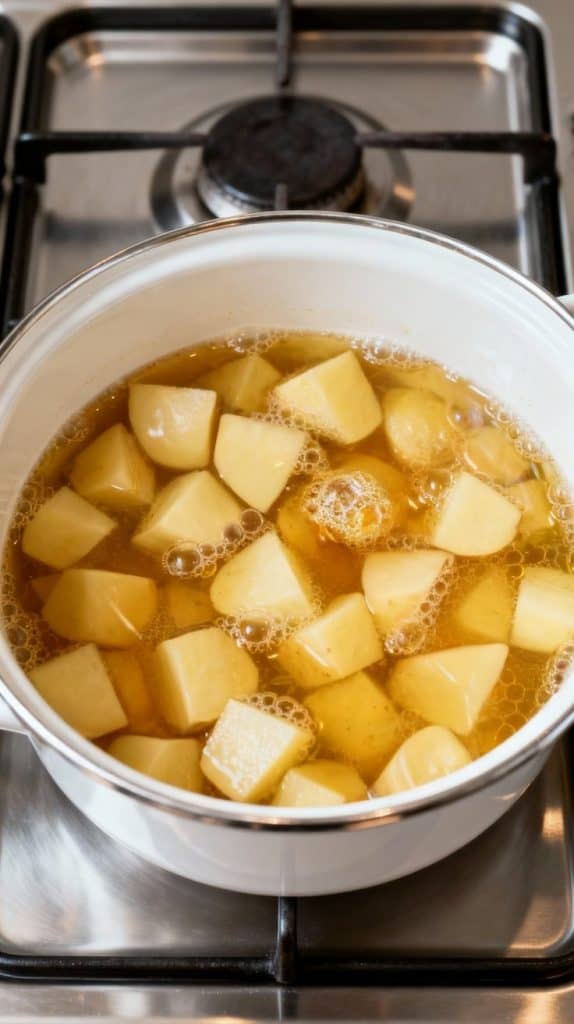 Add 2 peeled and diced russet potatoes and 4 cups vegetable broth to the pot. Bring to a boil, then reduce heat and simmer for 10 minutes.