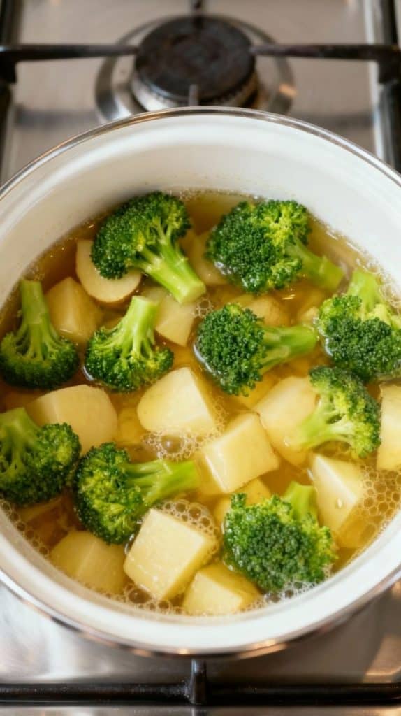 Add 4 cups broccoli florets to the pot. Simmer another 8–10 minutes, until both the potatoes and broccoli are very tender.