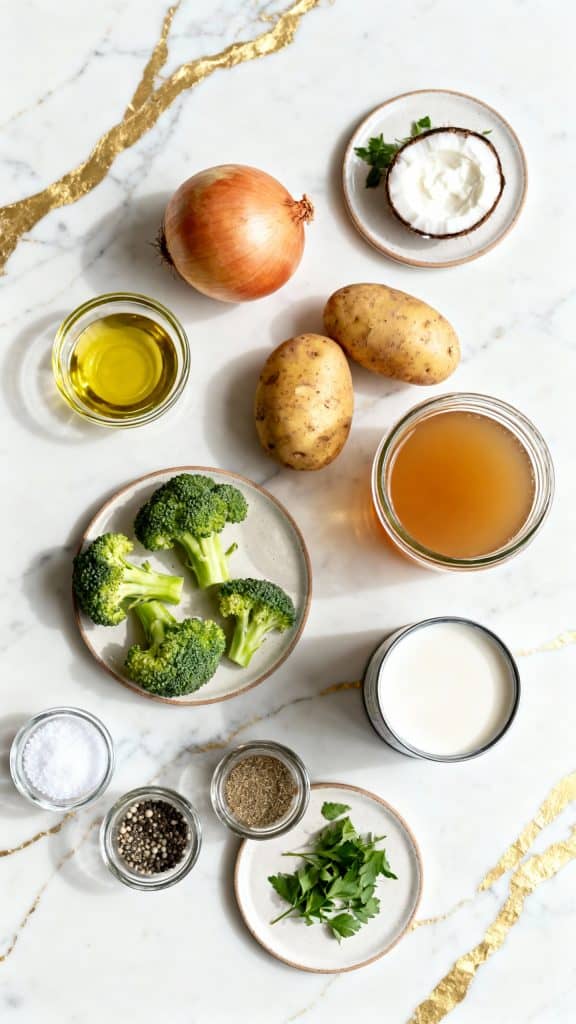 Potatoes naturally release starch as they cook and blend, which thickens the soup without needing cream or flour. Coconut milk adds creaminess and fat, balancing the flavor while keeping it dairy-free. Broccoli gives the soup body and a vibrant green color.