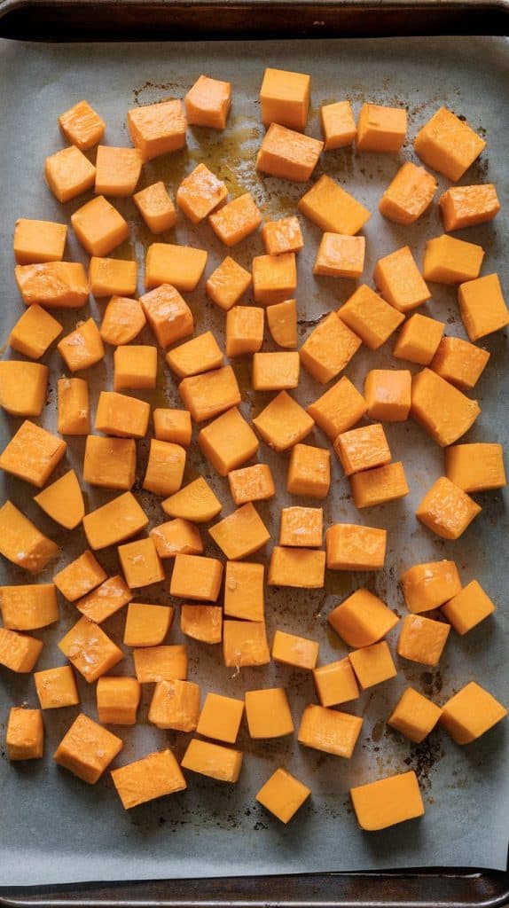 Preheat your oven to 425°F. Toss 2 cups peeled and diced butternut squash with 1 tablespoon olive oil and ½ teaspoon salt. Spread on a parchment-lined baking sheet and roast for 25–30 minutes, until golden and tender.